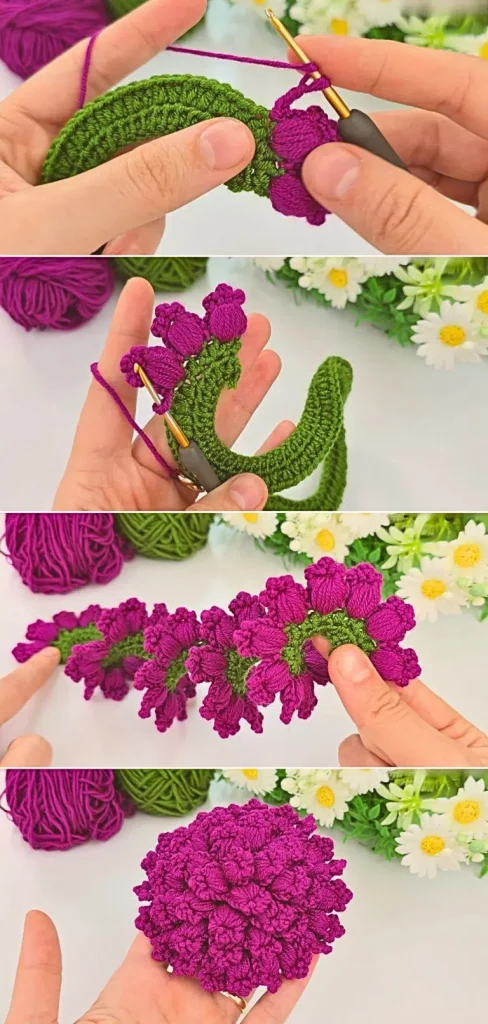 In many variations of the 3D Crochet Bud Flower – Pattern, the “Popcorn” or “Puff” stitch is used at the very center of the bud to create a dense, textured core. These stitches involve working multiple incomplete stitches into the same space and then joining them at the top to create a “bulge.” This creates a focal point for the flower, drawing the eye toward the center and emphasizing the contrast between the tight core and the flowing outer crochet petals.