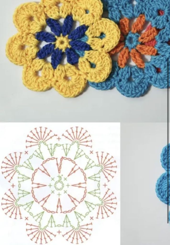 The construction of the Colorful flower coaster – Pattern usually begins at the center, working outward in rounds to form the flower shape.