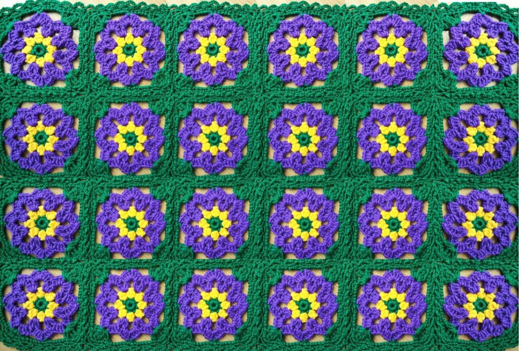 The transition from a circular flower to a square border is a critical skill in this Flower blanket in crochet – Pattern. This is usually achieved by using stitches of varying heights—such as using single crochets (sc) on the sides and treble crochets in the corners—to level out the rounds into a perfect square. Learning how to “square the circle” is a foundational technique that allows you to join your floral motifs together seamlessly, creating a clean and organized grid layout.