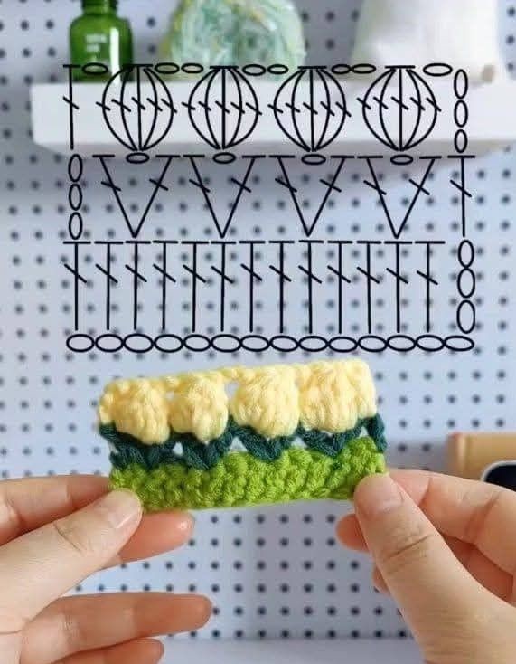 When discussing the Tulip stitch in crochet, we focus on the interplay between the “V-stitches” and the “clusters.” The green row, which represents the leaves, is almost always created using a V-stitch (one double crochet, one chain, and another double crochet in the same space). This creates a perfect little cradle for the colorful tulip bud that follows in the next row.