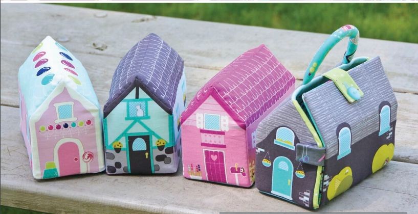 If you are making the bag for a child, the House-shaped bag with fabric print – Pattern can even double as a “quiet toy.” You can make the front door actually open with a button, revealing a “fussy-cut” character inside the lining. By using soft stabilizers instead of rigid ones, the house-bag becomes a squishy, huggable companion that also carries toys. The pattern is easily adapted for safety by replacing small buttons with Velcro or large snaps.