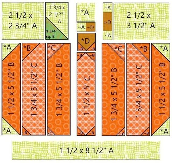 Begin by laying out your pumpkin pieces on a design wall or flat surface. A traditional pumpkin block typically features three main vertical sections for the pumpkin body, a small stem unit at the top, and background pieces that frame the shape and form the block’s edges.